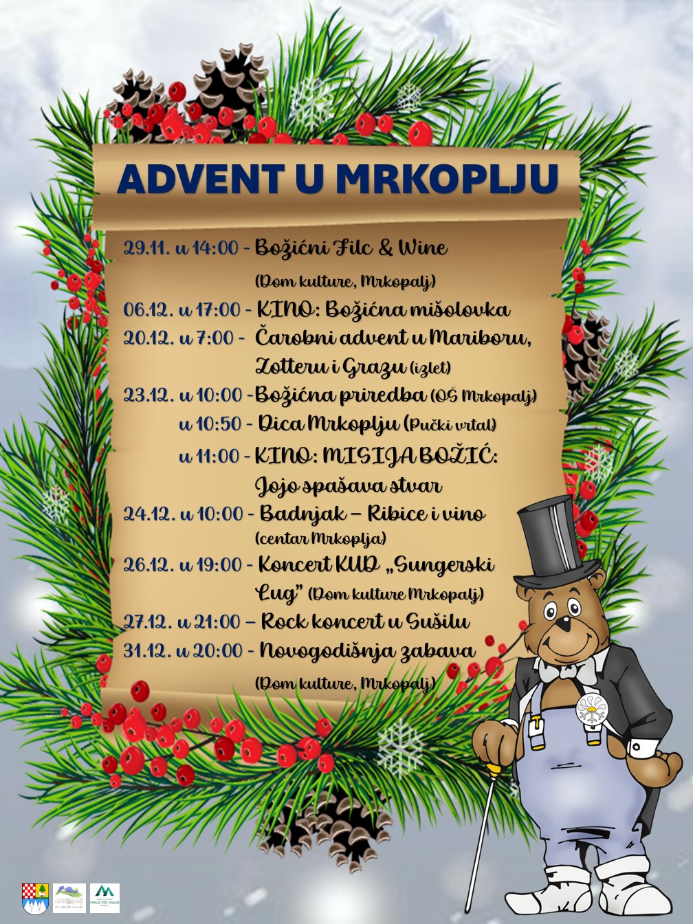 Doživite ovu jedinstvenu blagdansku priču koja uključuje sve od uživanja u Božićnom Filcu & Wineu, napetih filmskih projekcija poput “Božićne mišolovke”, pa do velikog izleta na čarobne advente u Mariboru, Zotteru i Grazu. Vrhunac programa obilježit će tradicionalni Badnjak uz ribice i vino, energični Rock koncert u Sušilu, te nezaboravna Novogodišnja zabava.