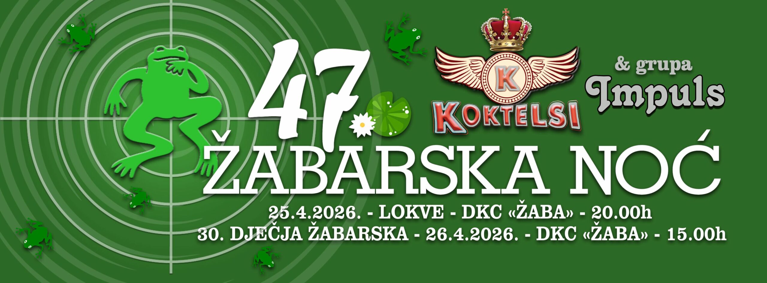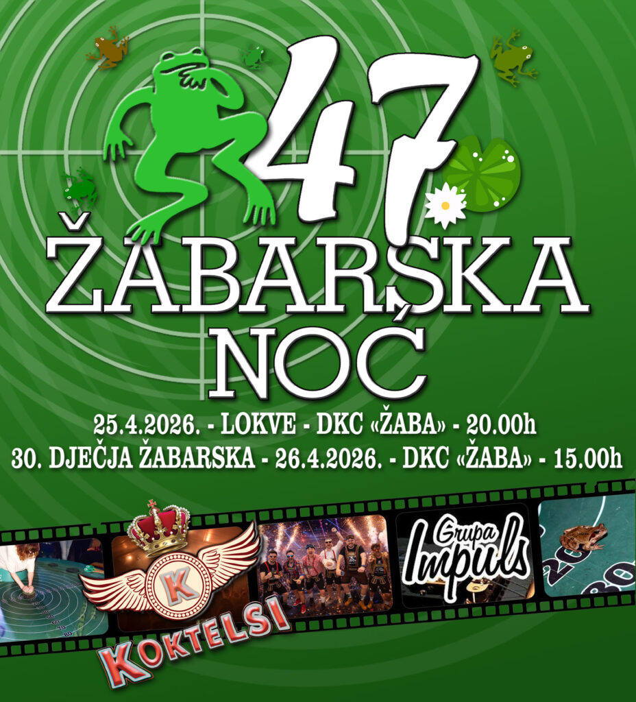 U subotu, 25. travnja, s početkom u 20:00 sati, na rasporedu je 47. Žabarska noć. Uz tradicionalno i uvijek uzbudljivo natjecanje u žabljim skokovima, posjetitelje očekuje bogat zabavni program. Za podizanje atmosfere i ples do ranih jutarnjih sati pobrinut će se popularni Koktelsi te grupa Impuls.